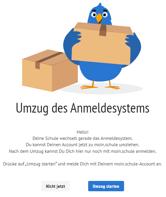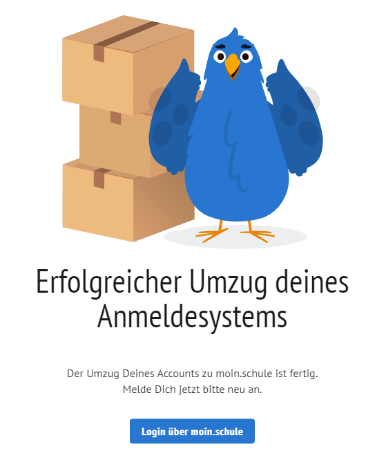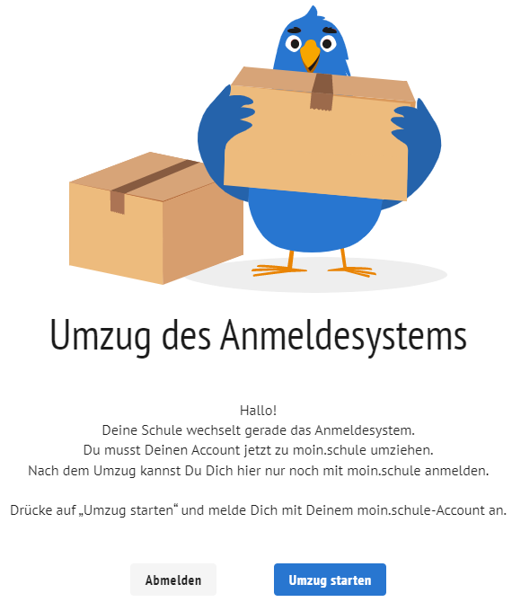 Wenn der Nutzer oder die Nutzerin Umzug starten gewählt hat, wird die Migration durchgeführt. Dabei wird ihm oder ihr unter Umständen die Anmeldemaske von moin.schule gezeigt. Er oder sie muss sich dort mit den Zugangsdaten für moin.schule authentifizieren. Anders als beim unmittelbar vorhergehenden Login-Vorgang werden in diesem Schritt also andere Zugangsdaten - nämlich die von moin.schule - abgefragt. Es ist daher wichtig, dass die Nutzerinnen und Nutzer die Anmeldemaske von moin.schule bereits kennen und dort die richtigen Zugangsdaten eingeben. Zudem sollten Sie überprüfen, ob Sie nicht aus Versehen in Hintergrund noch bei moin.schule angemeldet sind, um eine versehentliche Migration mit einem falschen moin.schule-Account zu verhindern.