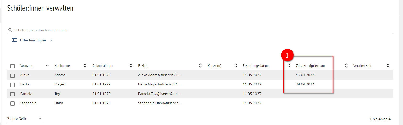 - Alle nicht migrierten Accounts werden in den Tabellen der Bereiche Verwaltung/Schüler:innen und Verwaltung/Lehrkräfte als veraltet angezeigt.