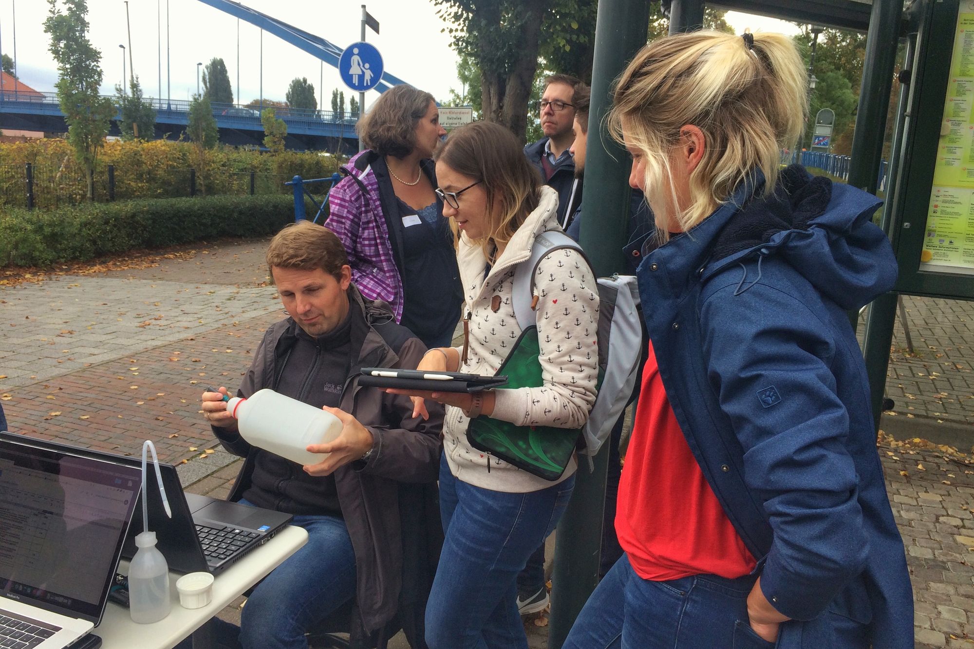 Nach einer kurzen Einführung wurde die Analyse arbeitsteilig vorbereitet. Die Teilnehmerinnen und Teilnehmer entnahmen selbstständig eine Wasserprobe und die Arbeitsstation mit digitalen Sensoren wurde eingerichtet. Dazu wurde die Software zur digitalen Messwerterfassung auf schuleigenen Notebooks aufgerufen. Über einen mobilen Hotspot konnten diese schuleigenen Notebooks auf die NBC und den darüber verfügbaren Messenger zugreifen, um das weitere Vorgehen mit der parallel arbeitenden Projektgruppe in Rinteln abzustimmen.